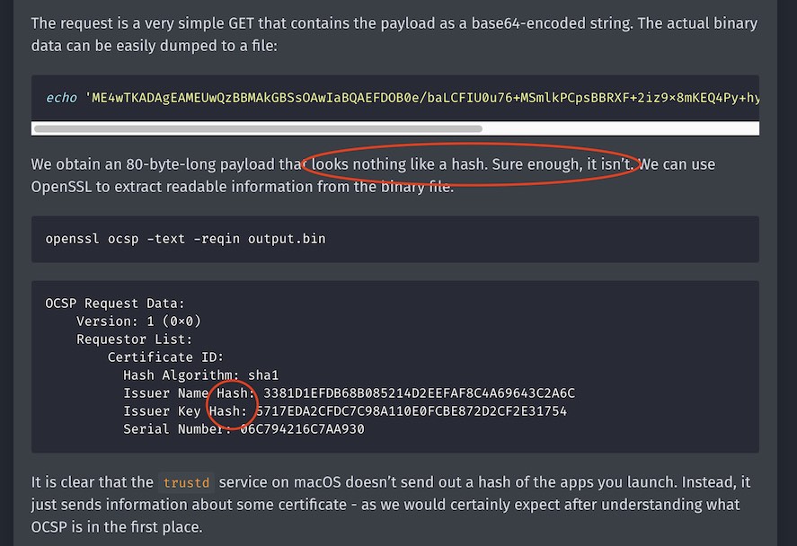 The thing that’s sent is indeed a hash, is indeed a unique identifier for almost all apps, and is indeed sent to Apple unencrypted in realtime with your IP. I simplified the explanation above to avoid having to explain OCSP and x509 and the PKI, and was deliberately careful not to claim that it was a hash of the file content of the application binary.